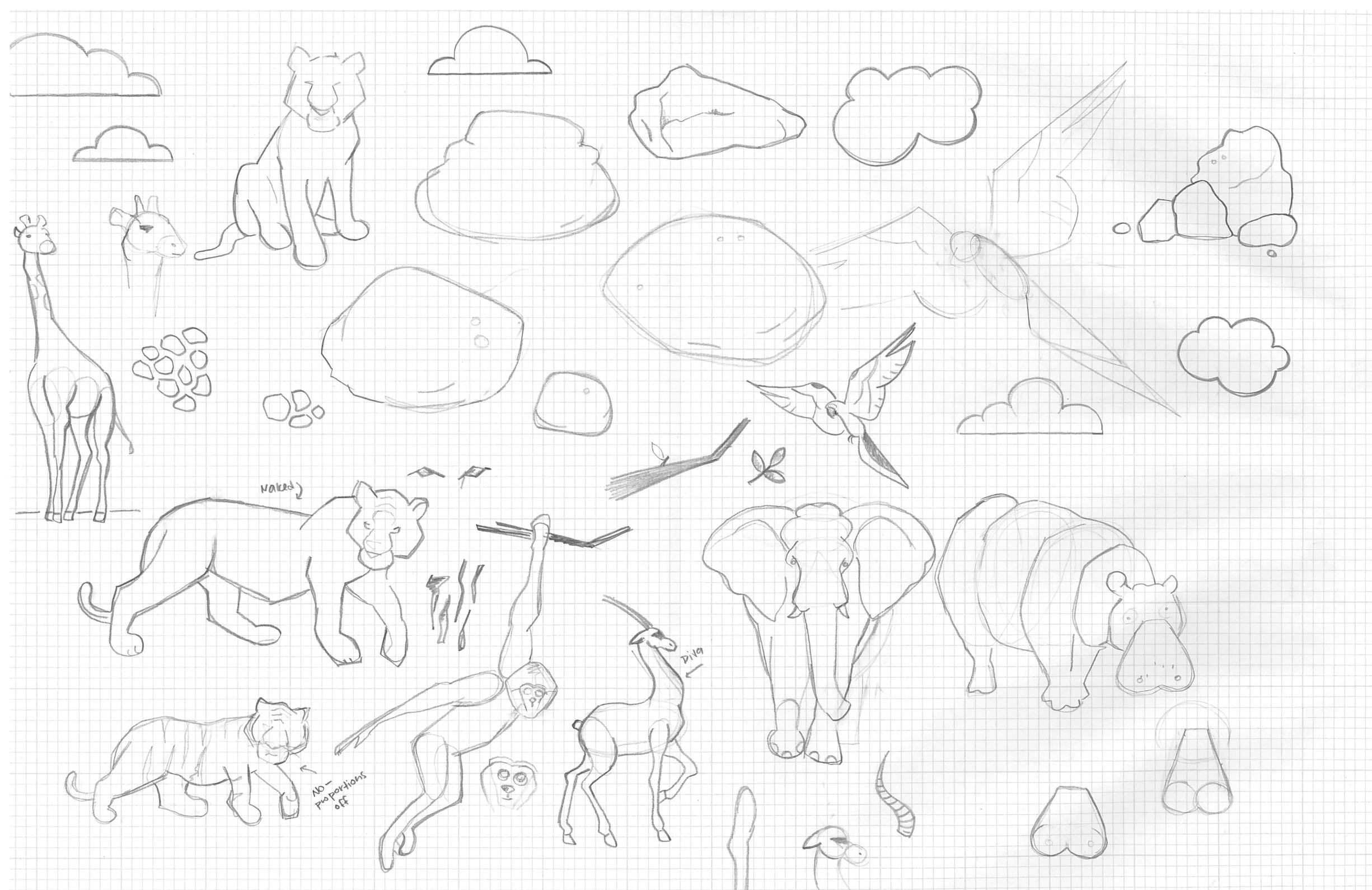 Though we were able to re-use much of the content from our previous event, we had to re-tool all of the graphics we had been using in the event materials for IP distribution reasons. My task was to create new vector images of zoo animals and environmental objects like rocks and branches to include in the package. The top-right image in the below assortment is the sketch that most of the vectors were based on, done by a co-worker, surrounded by my first round of vectors.